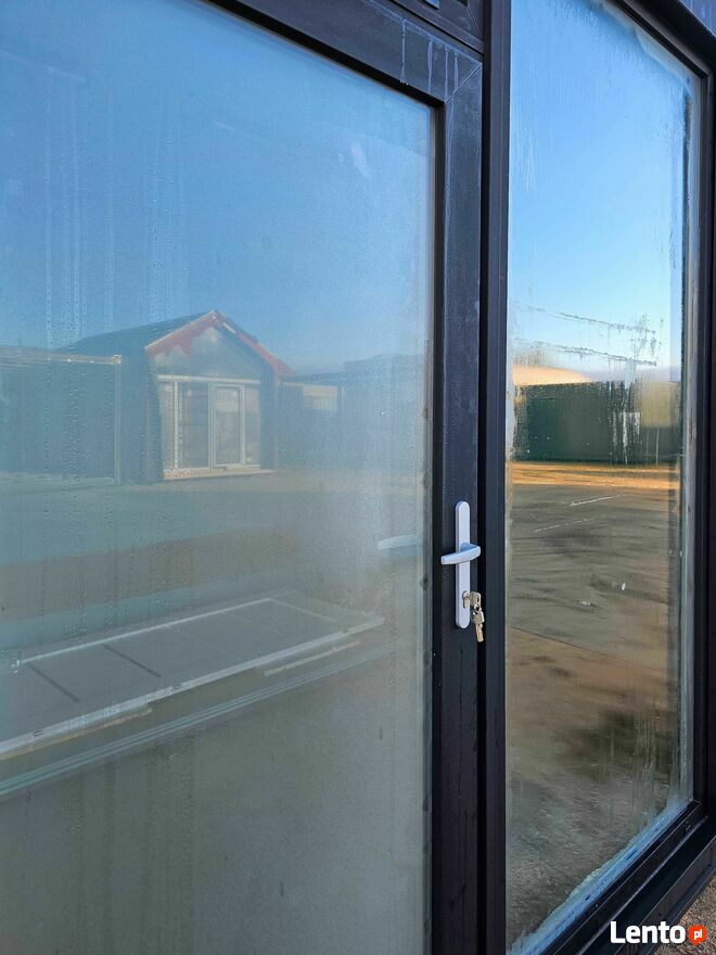 • Drzwi zewnętrzne PCV, kolor zewnętrzny czarny, wewnętrzny biały o wymiarze 1080x1075 mm + lufcik uchylny 1080x400 mm – 1 szt.